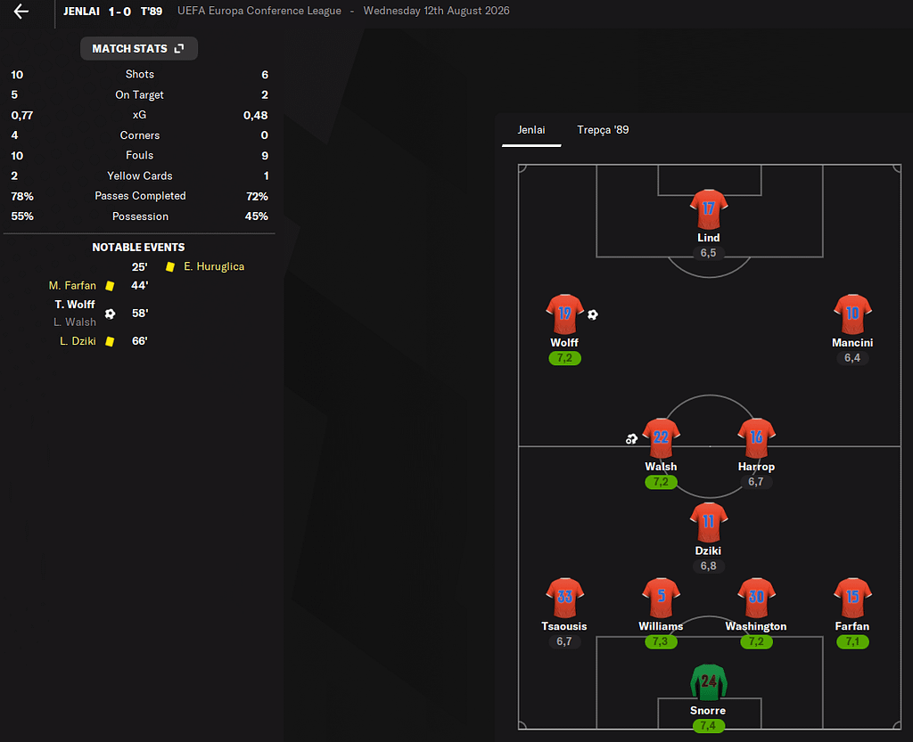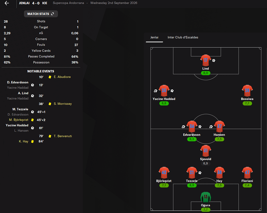 Přestupů už tolik není. Podařilo se mi konsolidovat tým. Potřeboval jsem křídlo, středního záložníka a pravého obránce. Bohužel křídlo a pravý obránce se přivést nepodařilo. Proto na křídle začínám učit útočníky Alexandera Linda a Hervé Ghauda.
