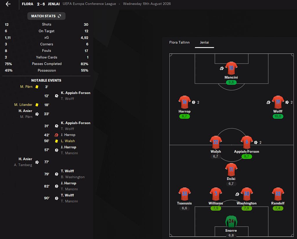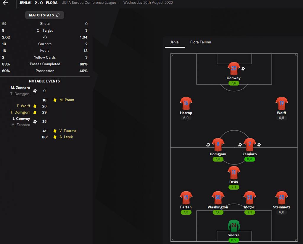 V posledním předkole nás čekal starý známý. Flora Tallin. Minulý rok jsme je porazili už v ligové fázy konferenční ligy. Nyní o jedno kolo dříve. Nicméně jsme si s nimi poradili parádně. Venku vyhráli 6:2 a doma už hráli uvolněně.