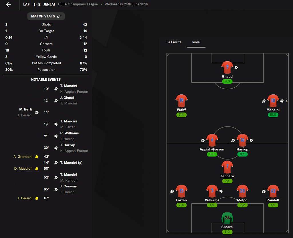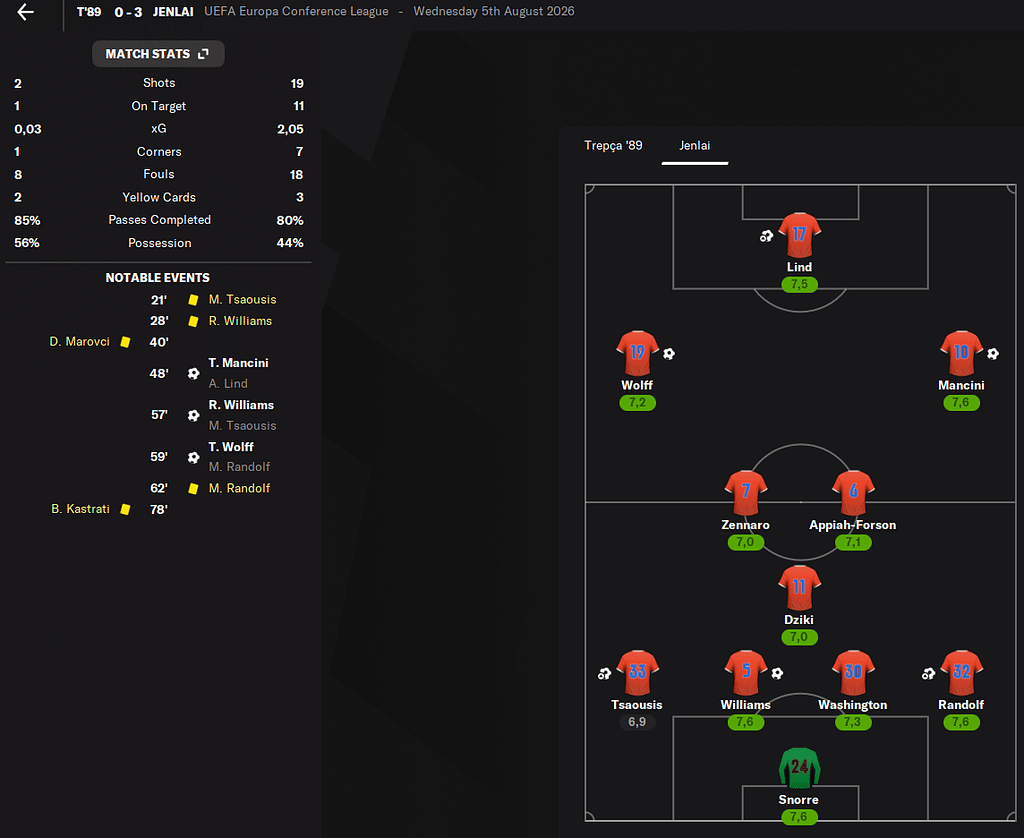 Zápas začal hrozně. Malá domů Motoce. Brankář Snorre se díval na prsa jedné fanynky a tekli jsme 0:1. V 6. minutě po hlavičce z centru po přímém kopu vyrovnal Williams. Nicnémě v 68. minutě prokličkoval od rohového praporku vše co mu stálo v cestě a zakončil tvrdě na zadní tyč.