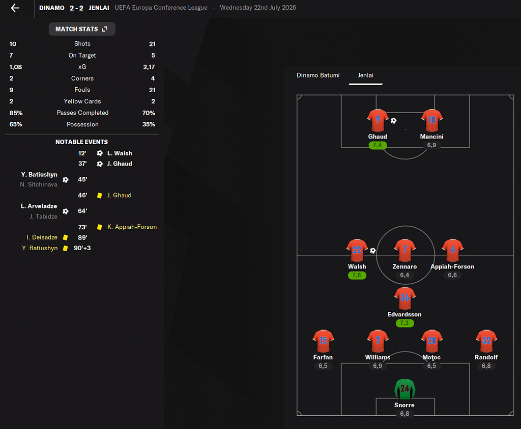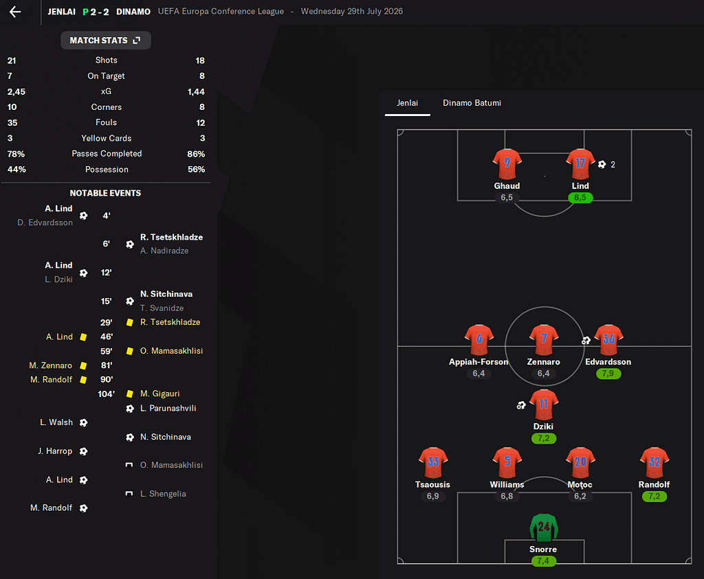První zápas v Batumi byl opravdu náročný. Díky Walshovi a Ghaudovi jsme vedli už 2:0, do šanty ale Dinamo snížilo a v 64. minutě dokonce vyrovnalo. Byli jsme mírně lepší, ale postup nebyl rozhodně nic jasného.