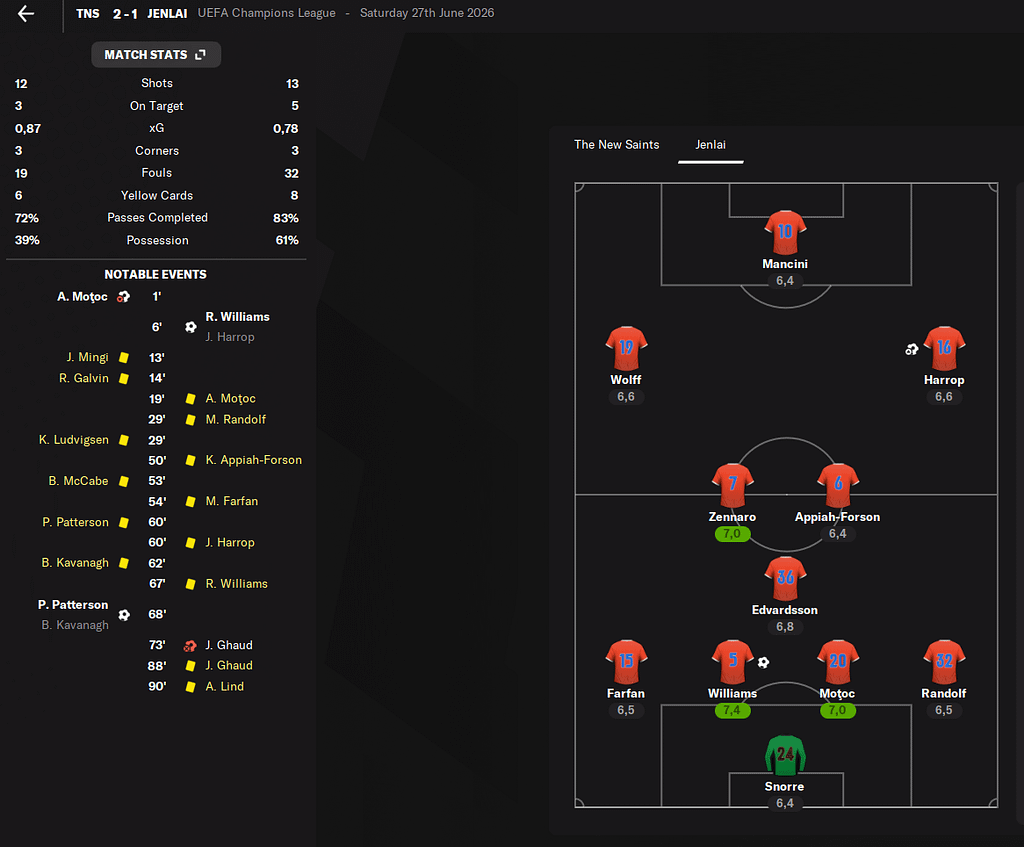Zápas proti Waleskému mistrovi jsme opět nezvládli. Doufám, že už nikdy se s nimi nepotkáme. Příští sezonu už bude mistr startovat v 1. předkole, tak se jim snad vyhneme :D.