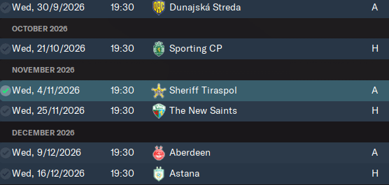 Soupeři v KL jsou těžší než minulý rok. Opět budeme Hrát s Aberdeenem. Sporting je nejtěžší soupeř. Od Sheriffu nevím, co čekat. No a čeká nás opět TNS. Snad se nám podaří je konečně porazit, Dunajská Streda a Astana budou týmy se kterými bychom rádi urvali aspoň bod.