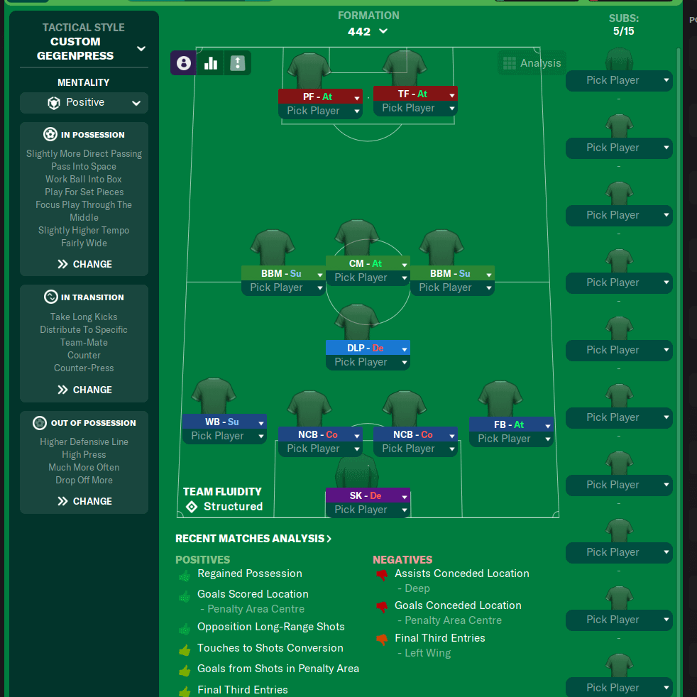 Po úvodním zápase (2:2) jsem se rozhodl změnit taktiku a z dosud hraného 4-4-2 jsem se rozhodl pro hru bez křídel (ač vlastně také 4-4-2). Chtěl jsem taktiku se 2 útočníky, ale takovou, kde budu mít převahu ve středu hřiště při odražených míčích, v čemž býval předtím problém.